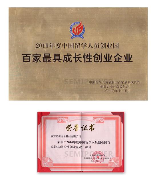 2010年度中國留學人員創業園百家最具成長性創業企業評審會議于2010年11月12日至11月13日在北京舉行。來自留學人員創業園、留學人員回國服務機構、風險投資機構、專業研 究機構、新聞媒體組成的評審委員會對申報企業進行了初審、復審和通審,最終確定83家企業入圍。西安芯派電子科技有限公司入圍,榮獲“2010年度中國留學人員創業園百家最具成長性創業企業”稱號。