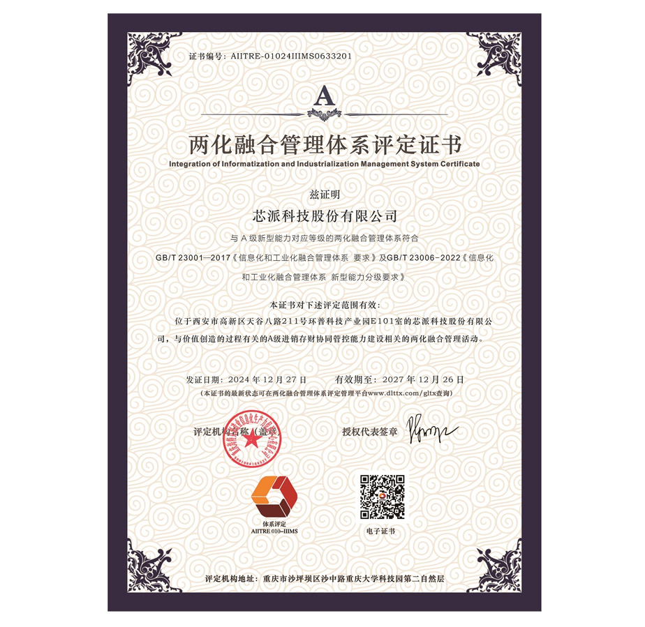 芯派科技積極響應國家關于推動兩化深度融合的號召,以“綜合提升、智能發展、追求卓越、持續發展”為兩化融合工作方針,通過成立兩化融合領導小組、編制發布體系文件、體系試運行等一系列扎實有效的工作,在體系建設過程中不斷優化業務流程、升級信息化系統,將公司訂單、銷售、發貨與財務等信息進行有效整合,實現降本增效、快速反應、精細管控的目標,最終順利通過體系認證。