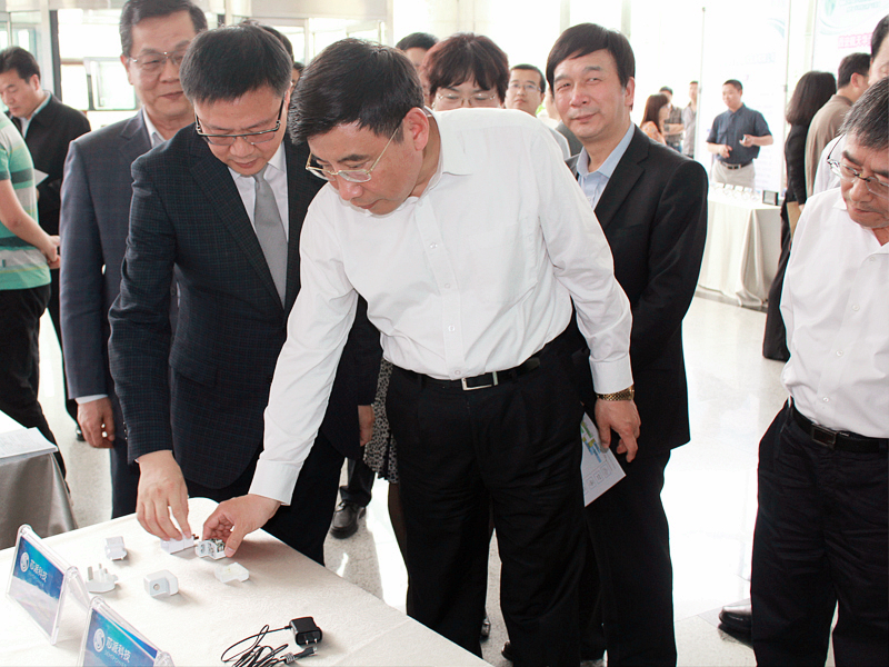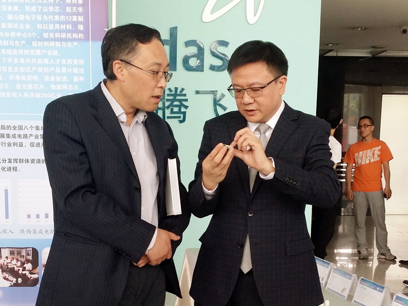 西安芯派電子科技有限公司董事長羅義先生正在向苗圩部長介紹公司的明星產品