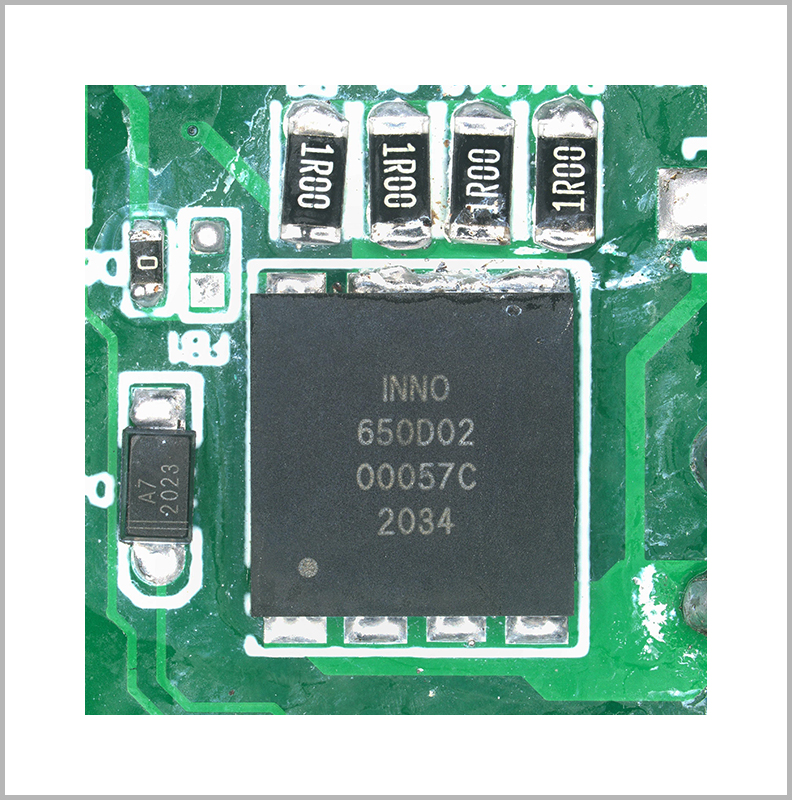 該適配器DEMO主功率開關器件來自國內GaN器件龍頭企業“英諾賽科科技有限公司”,型號為INN650D02,INN650D02是一顆經過市場驗證的可靠性極高的GaN器件,內阻僅為200mΩ,其封裝為DFN8*8,是英諾賽科針對PD市場推出的GaN器件。該器件同時還在努比亞65W USB PD氘鋒氮化鎵快速充電器、飛頻65W USB PD氮化鎵充電器、魅族65W氮化鎵充電器、ROCK 65W 2C1A氮化鎵快充充電器等多款PD產品采用。